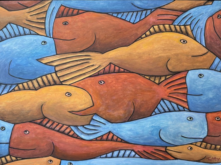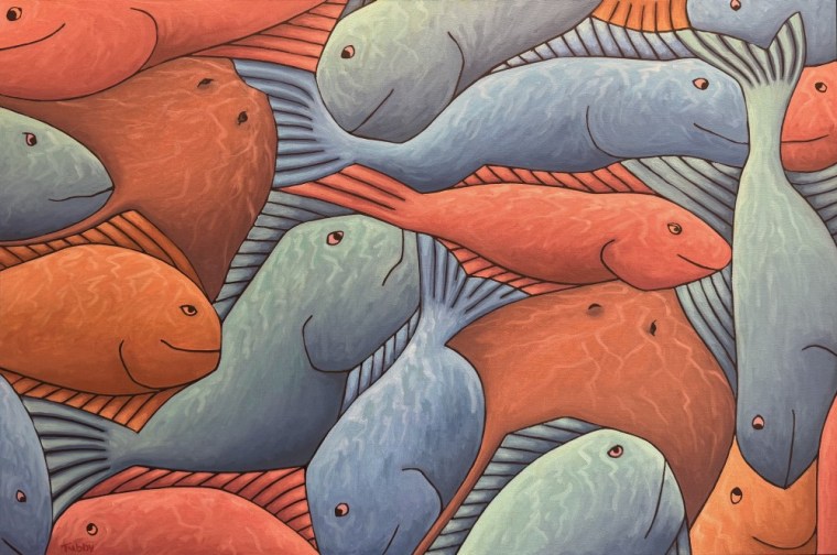Schooling, 13 1/4″H x 17 1/4″W, Oil on Claybord, SoldThe way it was, 25 1/2″H x 37 1/2″W, $3900Chicken of the Sea, 24″H x 24″W, SoldMorning Commute, 19″H x 15 1/2″W, Sold, oil on ClaybordUh-Oh, 37 1/2″H x 25 1/2″W, SoldChasing Tail, 25 1/2″H x 25 1/2″W, $2900Fish, 37 1/2″H x 37 1/2″W, Sold